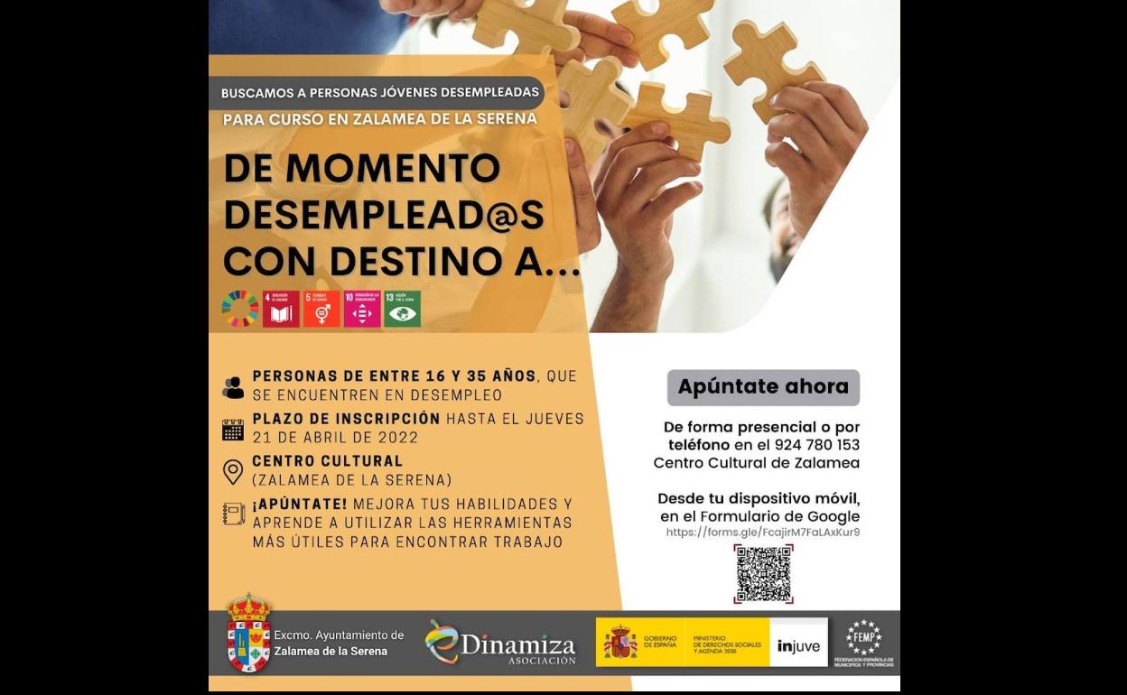El Ayuntamiento de Zalamea de la Serena, contando con la colaboración de la Asociación eDinamiza y la financiación del Ministerio de Derechos Sociales y Agenda 2030, el Instituto de la Juventud (INJUVE) y la Federación Española de Municipios y Provincias (FEMP), ha organizado una nueva edición del curso 'De Momento Desemplead@s con destino a…' en Zalamea de la Serena.