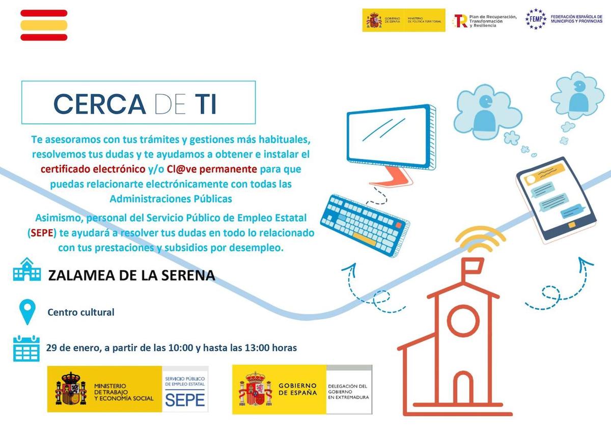 Durante la mañana de hoy lunes, día 29 de enero, la 'Administración Cerca de Ti' estará en Zalamea de la Serena para ayudar con los trámites y gestiones con la Administración General de Estado.