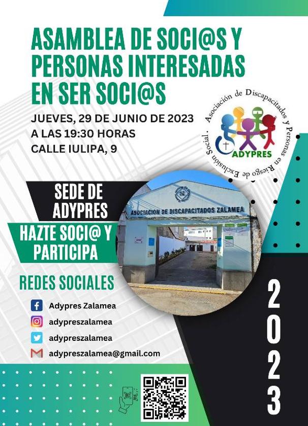 La Asociación de Discapacitados y Personas en Riesgo de Exclusión Social Adypres Zalamea han convocado una Asamblea de Socios a la que podrán asistir tanto ... los socios como las personas que estén interesadas en serlo.
