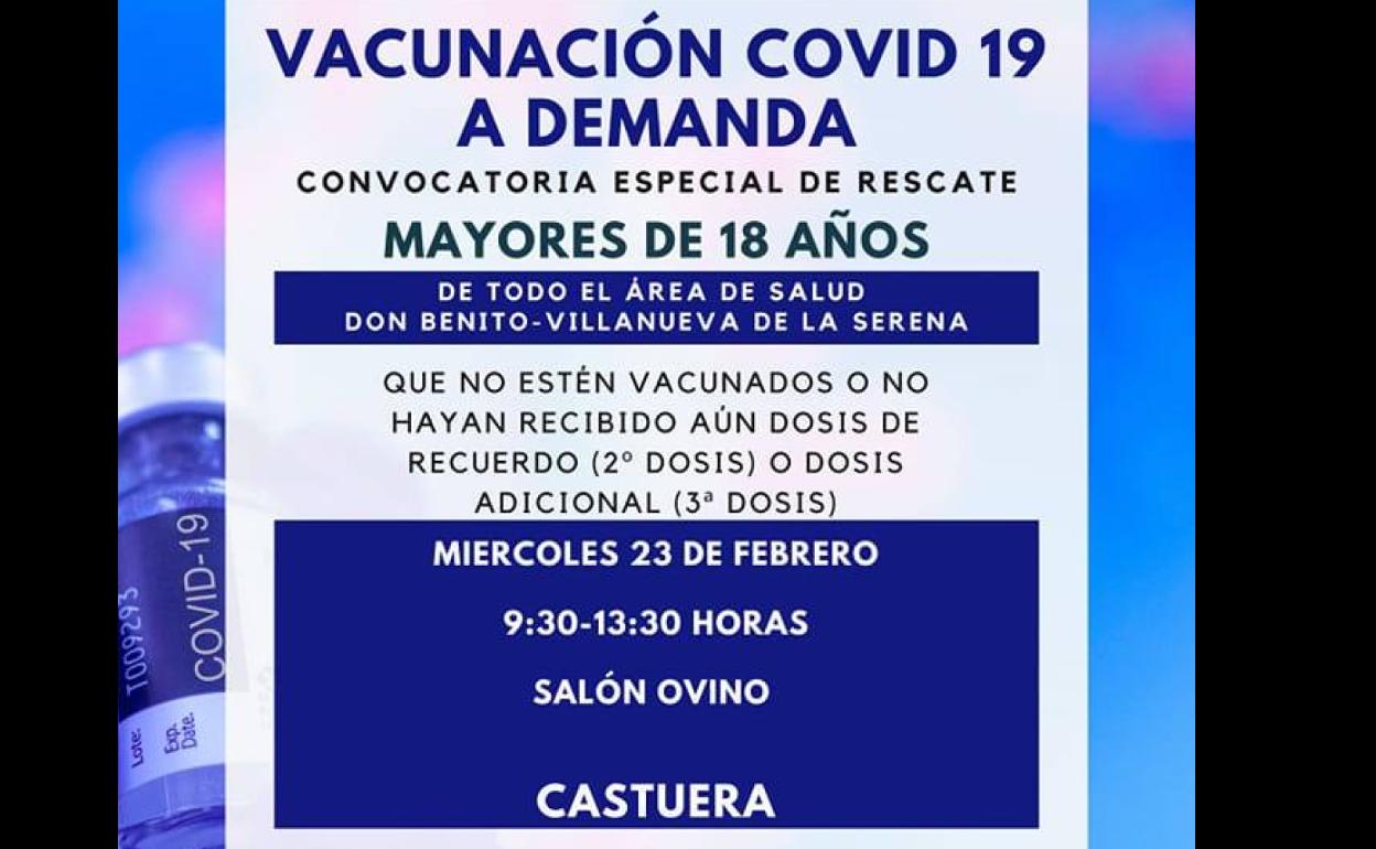 Con el objetivo de vacunar al mayor número de población posible, el Área de Salud de Don Benito - Villanueva ha organizado para el próximo miércoles 23 de febrero una vacunación masiva dirigida a personas mayores de 18 años no vacunados o pendientes de la 2ª o 3ª dosis. Dicha jornada de vacunación tendrá lugar en el Salón Ovino de Castuera, de 9:30 a 13:30 horas.