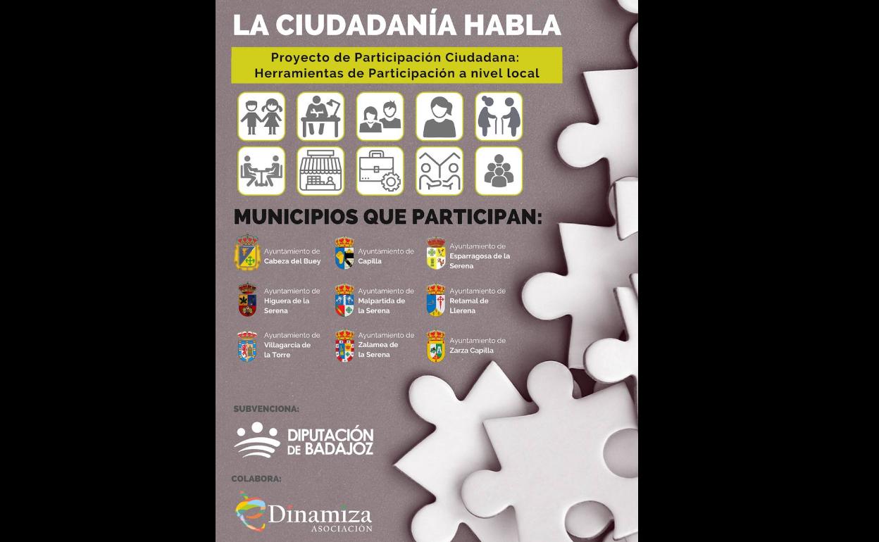 La asociación eDinamiza está desarrollando el proyecto 'La Ciudadanía Habla (herramientas de participación a nivel local)'. Se trata de un proyecto de Participación Ciudadana enmarcado dentro de la Convocatoria de Subvenciones de la Diputación de Badajoz destinadas a ayuntamientos y entidades locales menores de la Provincia de Badajoz que promuevan proyectos de participación social durante el año 2020.