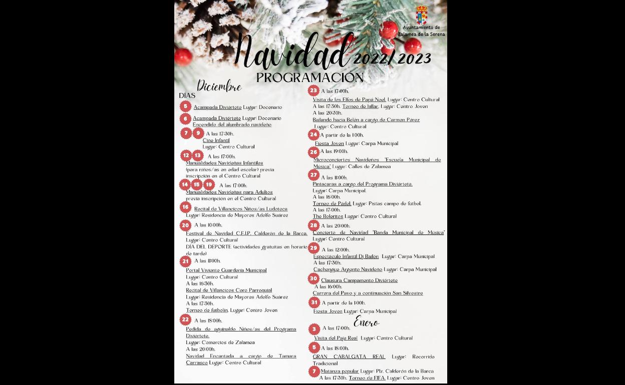 El Ayuntamiento de Zalamea de la Serena ha organizado un amplio programa de Navidad compuesto por más de una veintena de actividades para el disfrute de pequeños y mayores, aunque, como no puede ser de otra forma en estas fiestas de ilusión, los platos fuertes estarán dirigidos a los niños.