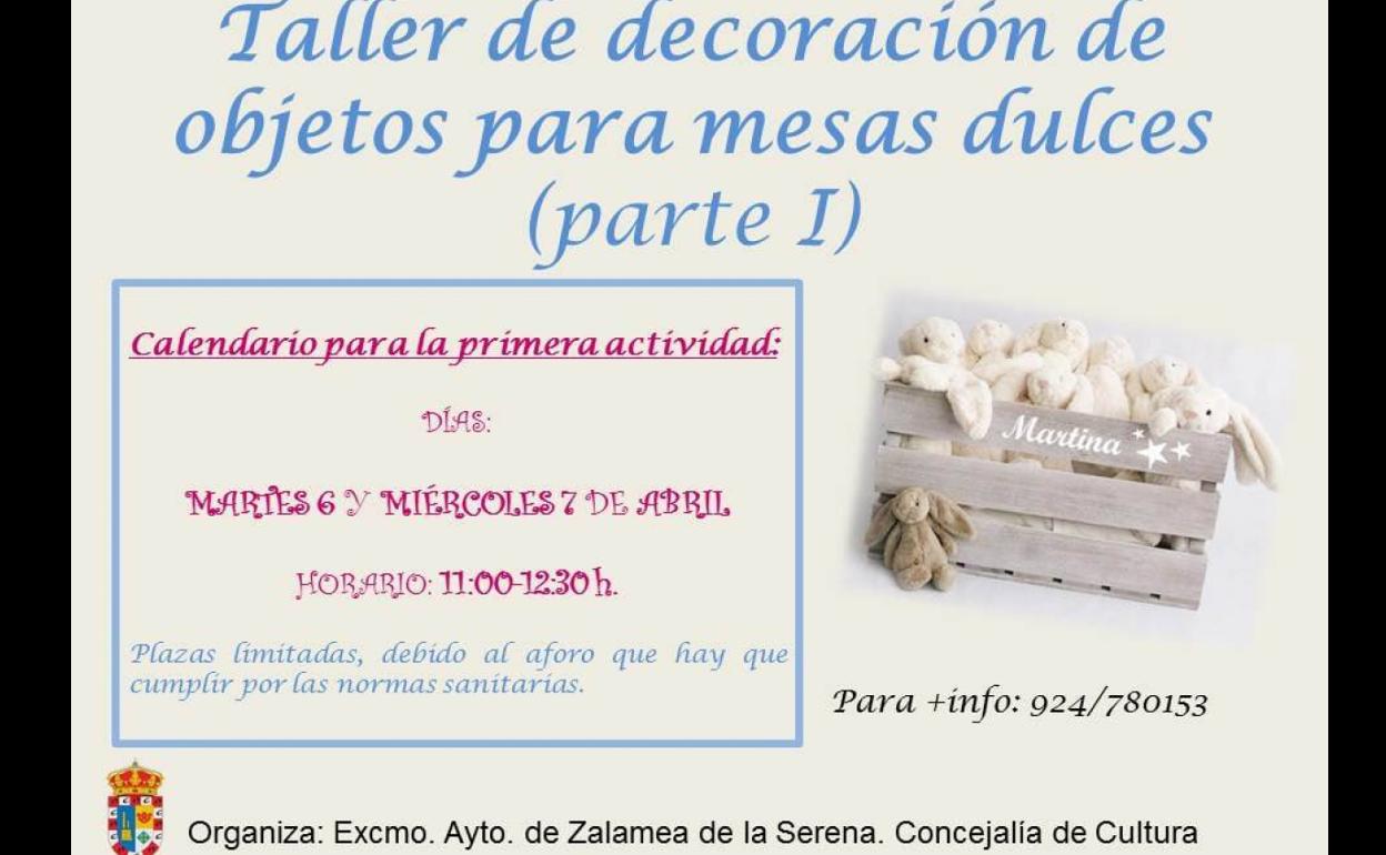 El Centro Cultural de Zalamea de la Serena acogerá un taller de decoración de objetos para mesas dulces. Se celebrará los días martes 6 y miércoles 7 del próximo mes de abril en horario de mañana, de 11:00 a 12:30 horas.