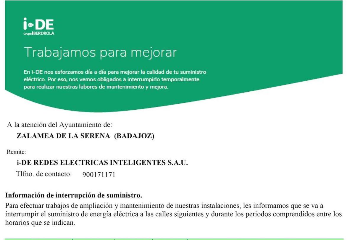 El Ayuntamiento de Zalamea de la Serena ha informado del aviso emitido por I-De Redes Eléctricas Inteligentes S.A.U., desde donde se ha informado de la interrupción del suministro de energía eléctrica el próximo 7 de mayo.