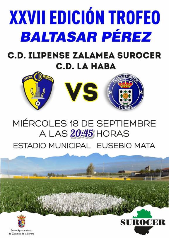 Para la ocasión, el CD Ilipense recibirá al CD La HabaMañana miércoles, día 18 de septiembre, enmarcado dentro de los actos organizados con motivo de la celebración de la Feria y Fiestas de la Cruz de Zalamea de la Serena, el CD Ilipense Zalamea Surocer recibirá al CD La Haba para disputar el XXVII Trofeo Baltasar Pérez.