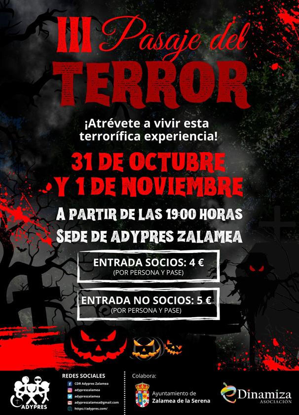 La Asociación eDinamiza y ADYPRES Zalamea han organizado, por tercer año consecutivo y después del gran éxito obtenido en las dos anteriores ediciones, el 'Pasaje del Terror' para celebrar Halloween. El Pasaje del Terror se celebrará los días 31 de octubre y 1 de noviembre, en la Sede de Adypres.