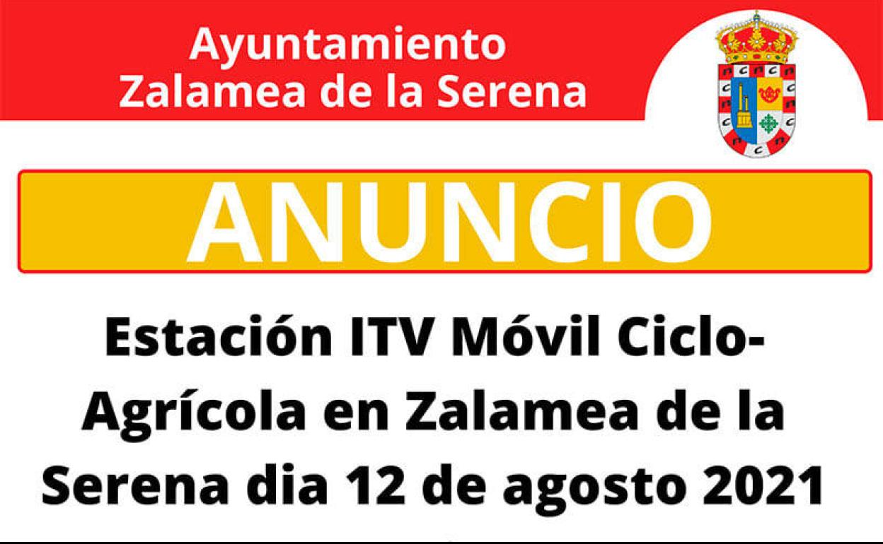 Una estación ITV Móvil Ciclo Agrícola se desplazará a Zalamea de la Serena el jueves 12 de agosto para prestar su servicio de inspección técnica en la localidad, y más concretamente, en la Sociedad Cooperativa del Campo 'La Serena'.