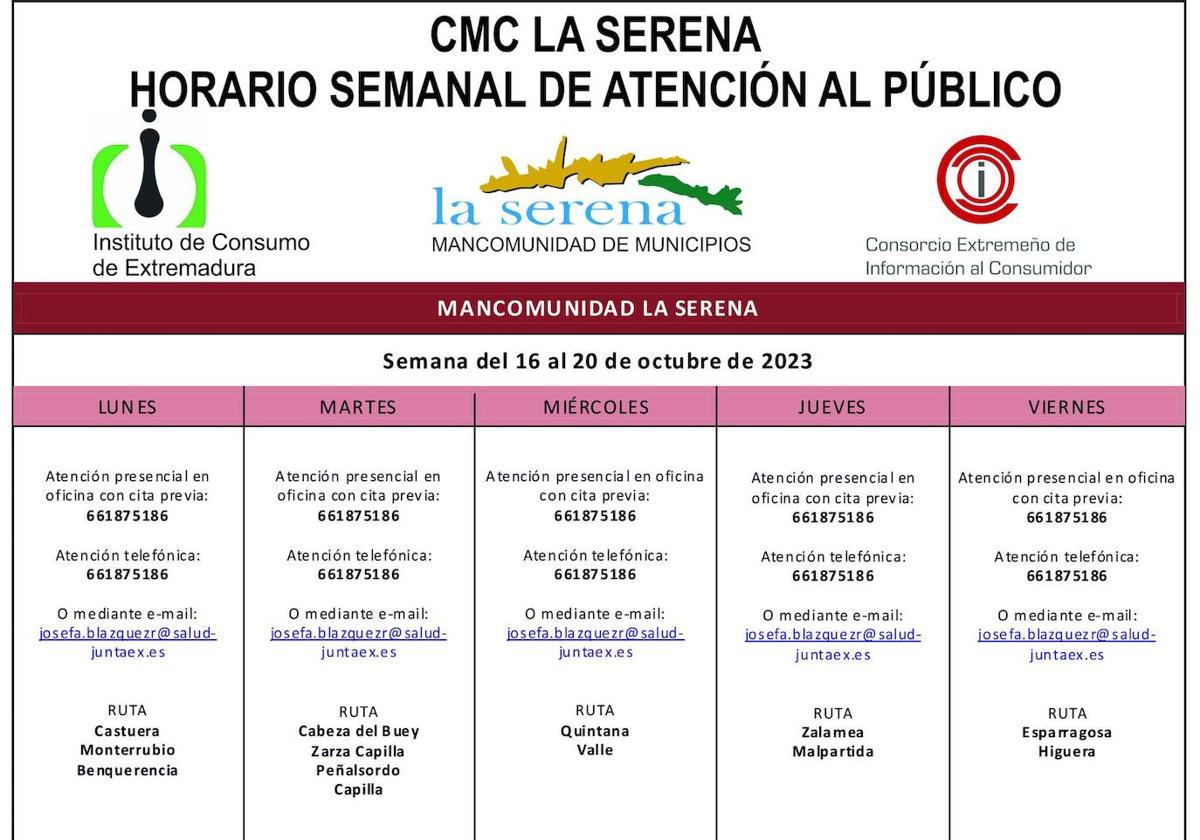 La Mancomunidad de Municipios de La Serena ha anunciado el horario de Atención al público del CMC La Serena para la semana del 16 al 20 de julio con la ruta que se hará por todos los municipios que la conforman.