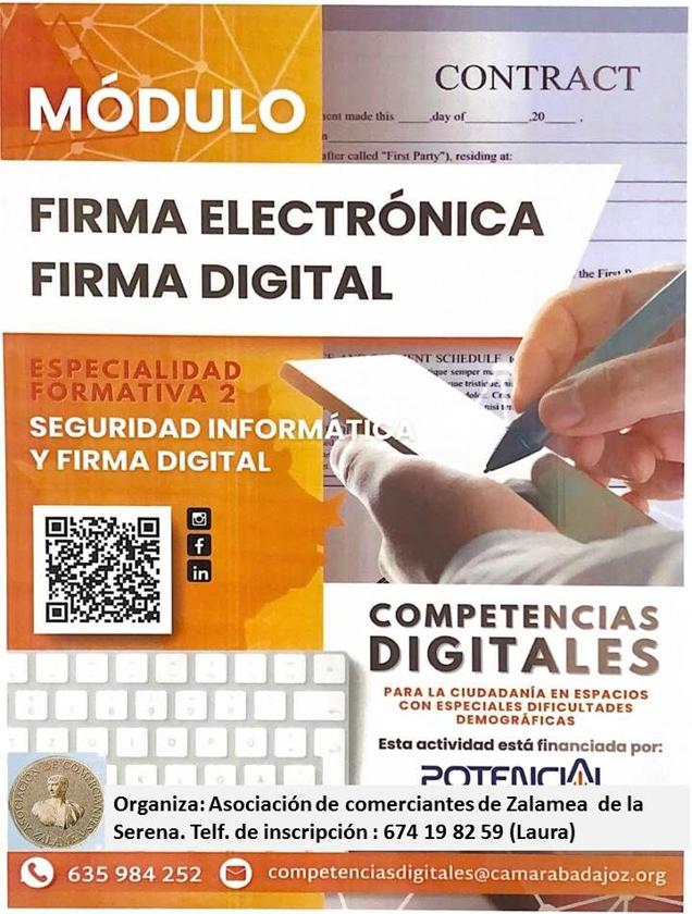 La Asociación de Comerciantes de Zalamea de la Serena ha organizado un curso de Competencias digitales para la ciudadanía en espacios con especiales dificultades demográficas, en el que entre otros temas se van a cursar 'firma electrónica/ firma digital, tipos de certificados, antivirus, trámites de la vida cotidiana.... etc'.