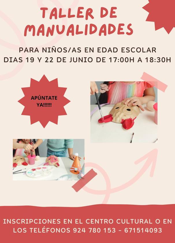Los próximos días 19 y 22 de junio, los más pequeños de Zalamea de la Serena podrán disfrutar de unas divertidas tardes participando en un taller de manualidades, puesto en marcha a través del Centro Cultural de Zalamea de la Serena.