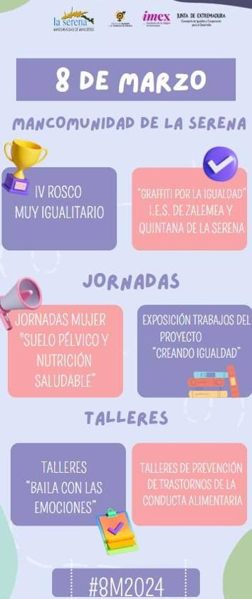 Mañana viernes, día 8 de marzo, se celebra el Día Internacional de la Mujer, una fecha que quieren conmemorar desde la Oficina de Igualdad y Violencia de Género de la Mancomunidad de Municipios de la Serena, para lo que están llevando a cabo diferentes actos y eventos en los pueblos de la comarca.