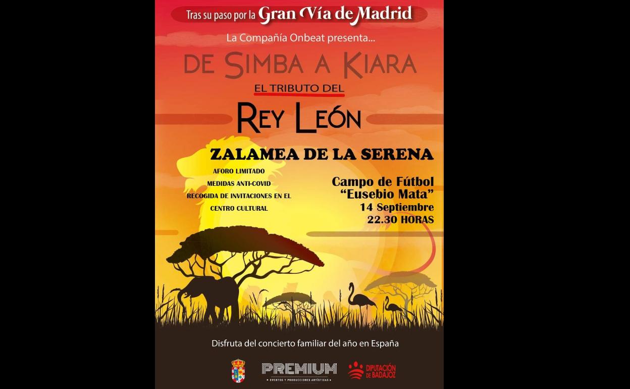 La magia de la selva llegará a Zalamea de la Serena de la mano del Musical Tributo del Rey León, 'De Simba a Kiara', presentado por la compañía Onbeat. Este espectáculo infantil tendrá lugar el próximo 14 de septiembre en el campo de fútbol 'Eusebio Mata' a partir de las 22:30 horas.