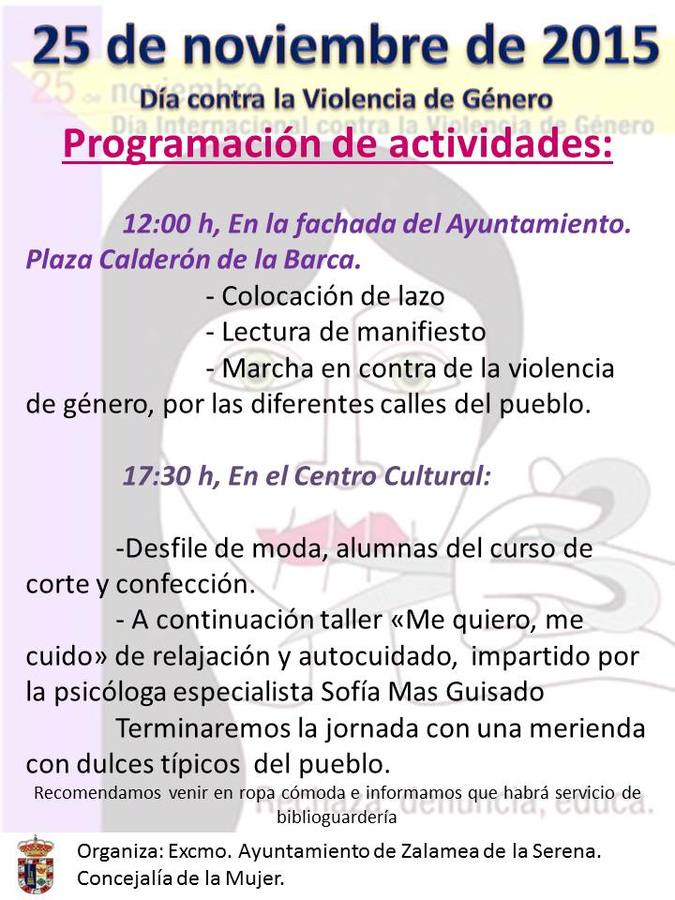Ya por la tarde, a partir de las 17.30h, en el Centro Cultural de Zalamea tendrán lugar otra serie de actividades en conmemoración de este día. En primer lugar, habrá un desfile de moda a cuenta de las alumnas del curso de corte y confección de la localidad. De forma seguida, se llevará a cabo el taller Me quiero, me cuido, impartido por la psicóloga especialista Sofía Mas Guisado. Por último, como conclusión de la jornada se ofrecerá una merienda para todas con dulces típicos del pueblo.