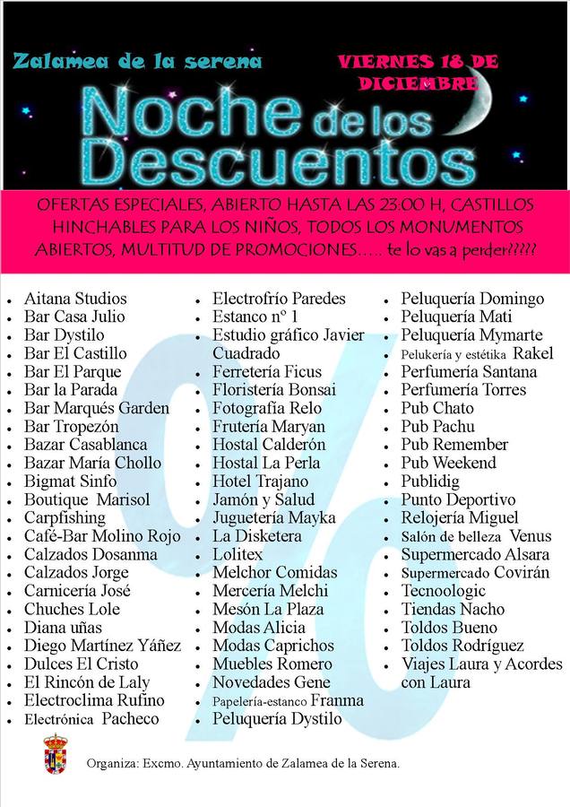Debido a esto, y con la intención de reactivar la economía local y favorecer al pequeño comercio, el próximo viernes 18 de diciembre los establecimientos de Zalamea estarán abiertos hasta las 23.00h. Para que de esta manera, todo aquel que lo deseé comience sus compras navideñas y pueda dar un agradable paseo por la localidad. Esta iniciativa incluye también ofertas especiales y promociones por parte de los diferentes comercios locales en sus productos.