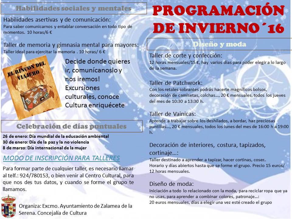 Con la llegada de enero, el centro cultural de Zalamea ha presentado la programación para la próxima temporada. Una gran variedad de talleres, cursos y actividades de diversa índole que se impartirán en la localidad. Varias secciones llenarán el calendario cultural de este invierno. En primer lugar, dentro del apartado de diseño y moda se ofrecerá un taller de corte y confección, que constará de 12 horas mensuales a lo largo de varios días, y tendrá un importe de 15 euros.