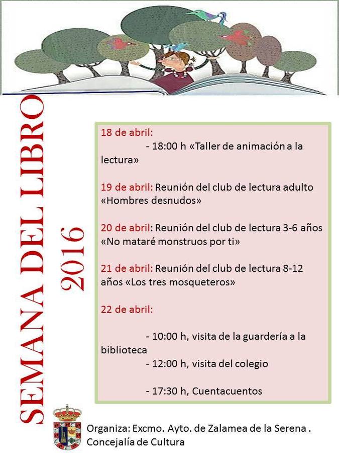 En conmemoración con este día, Zalamea ha preparado una serie de actividades que comenzarán el 19 de abril. Este día tendrá lugar la reunión del club de lectura del grupo de adultos, donde analizarán el Premio Planeta Hombres desnudos de la escritora española Alicia Giménez Barlett. Tras la presentación de la obra se propiciará, como ya es habitual, un debate en torno a la novela donde cada participante podrá exponer su visión del libro y de los temas que se tratan en él.