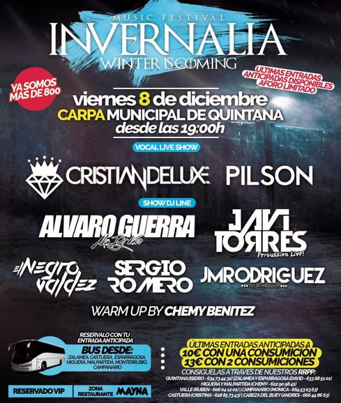 La localidad vecina de Quintana acogerá el próximo 8 de diciembre el festival Invernalia Music Festival. Un evento denominado por sus organizadores como "revolucionario", donde ... los jóvenes de la comarca podrán disfrutar de música más actual y el ambiente más animado haciendo frente a las bajas temperaturas que se registran en esta época.