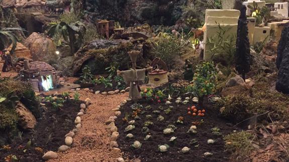 Chozos, casas de construcción hebrea, el castillo de Herodes y hasta el pesebre con una cuadra en los laterales recrean perfectamente la vida diaria de los habitantes del pueblo. Asimismo, incluye también un extenso huerto que llama la atención por la meticulosidad de las hortalizas y los utensilios de labranza. Respecto al niño Jesús que siempre llama la atención por la descompensación de tamaño con el resto de figuras en la mayoría de belenes, decidí cambiar el que estaba, por uno que compré en Fátima y que cuadra perfectamente con el resto del Nacimiento, declara Manuel Moreno.