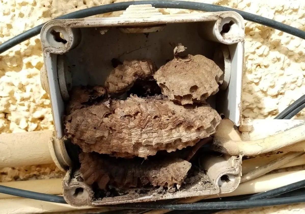 Un panal en una caja de registro tras los apagones de los últimos días en Zalamea
