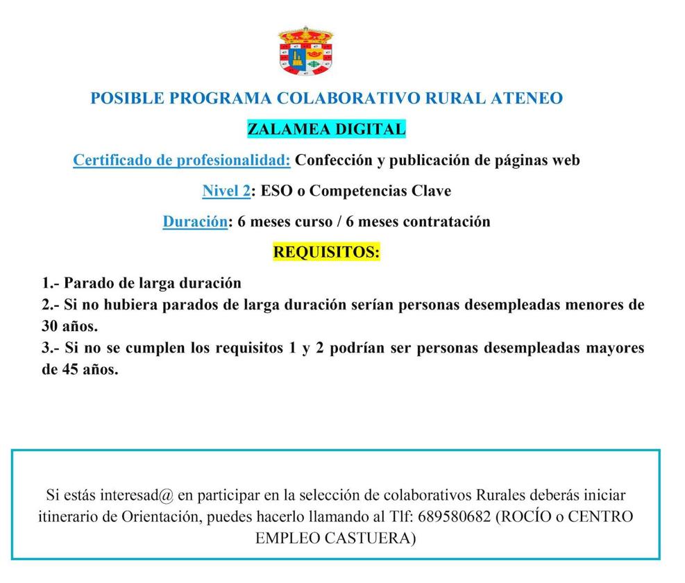 El Ayuntamiento de Zalamea de la Serena ha informado que próximamente comenzará un nuevo Programa Colaborativo Rural Ateneo, 'Zalamea Digital', que otorgará a los participantes el Certificado de Profesionalidad de Confección y Publicación de Páginas Web.