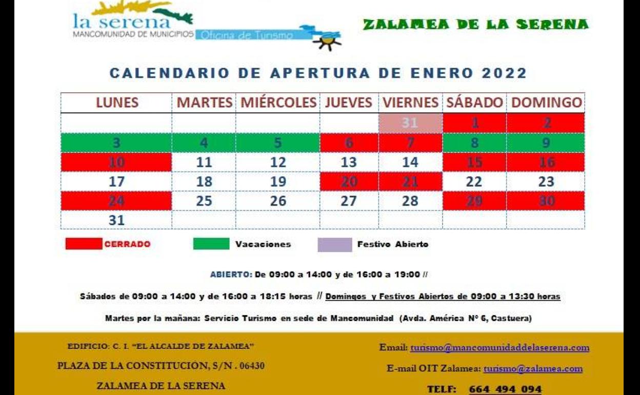 La Oficina de Turismo de Zalamea de la Serena ha publicado el calendario de apertura del mes de enero para que las personas interesadas en utilizar este servicio puedan conocer su disponibilidad de antemano.