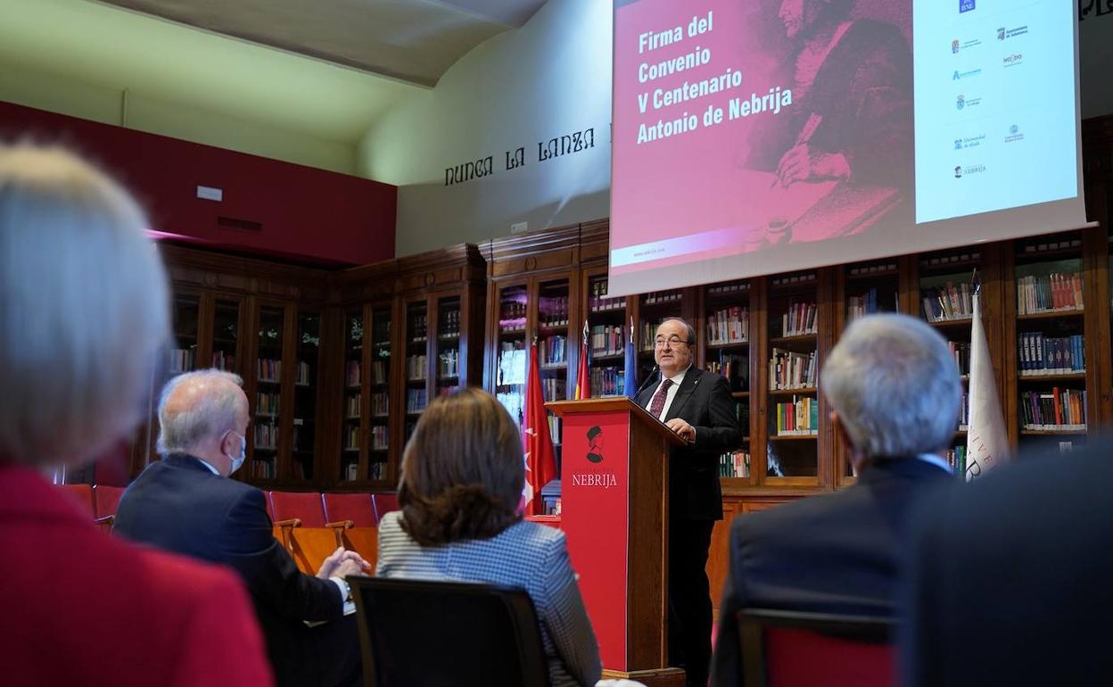 El acto tuvo lugar en el Campus de Madrid-Princesa de la Universidad Nebrija y fue presidido por el Ministro de Cultura y Deporte, Miquel Iceta, quién manifestó que «vamos a aprovechar ese quinto centenario del fallecimiento de Antonio de Nebrija para rendir homenaje a su obra, recordar a la persona y, sobre todo, recordarnos a nosotros mismos que somos depositarios y portadores de una lengua que tiene vocación universal, que tiene vocación de permanencia y que nos va a permitir seguir ofreciendo a todo el mundo unos valores que nos vamos a dedicar, entre todos, a engrandecer», según recoge en nota de prensa el Ministerio de Cultura y Deporte.