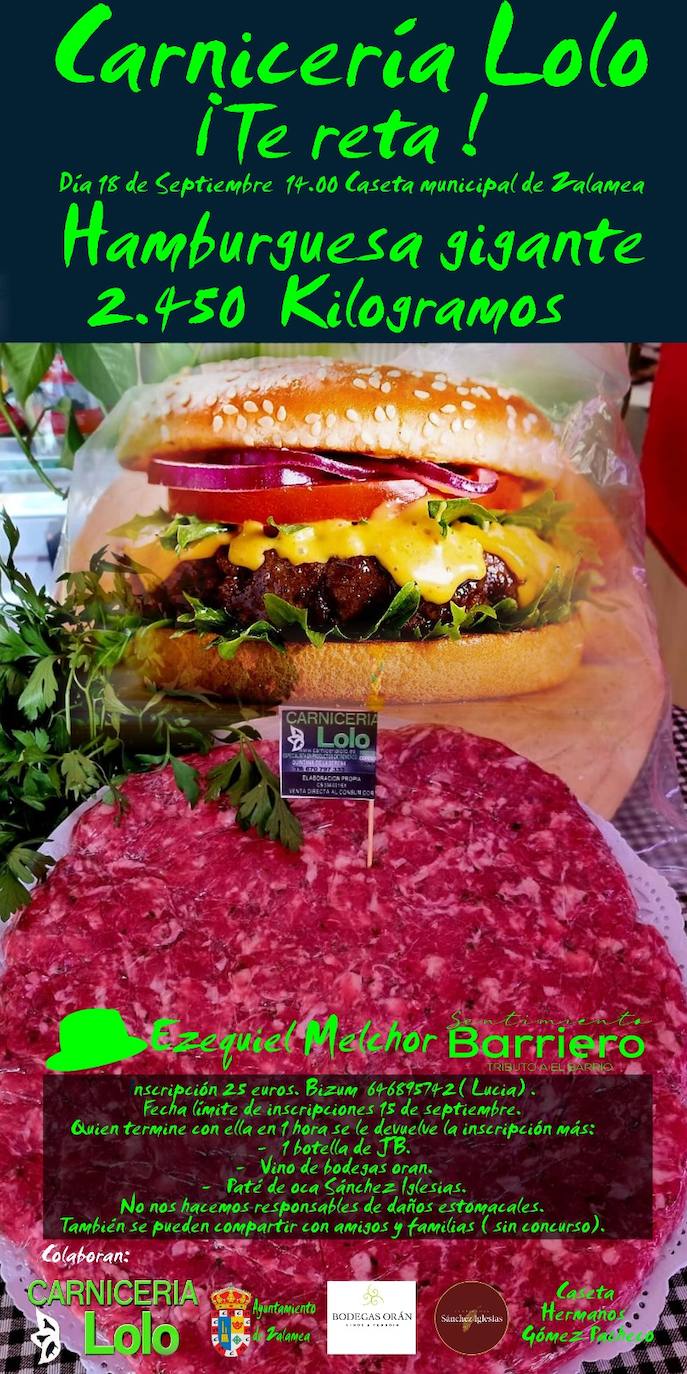 Dentro del programa de actividades, el lunes 18 de septiembre se llevará a cabo un reto para comilones; el Reto de la Hamburguesa, en el que la Carnicería Lolo retará a todo aquel que se atreva a comerse una hamburguesa gigante de 2.450 kilogramos.