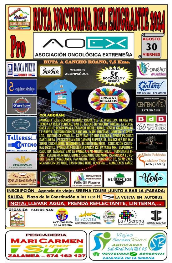 La Asociación Senderista de Zalamea de la Serena ha organizado para el próximo sábado, día 30 de agosto, la Ruta Nocturna del Emigrante Pro AOEX, cuya objetivo, además de vivir una noche de convivencia, es recaudar dinero para la lucha contra el cáncer ayudando a la Asociación Oncológica Extremeña Don Benito-Villanueva de la Serena y en agradecimiento a la noble labor que llevan a cabo con los enfermos de cáncer y sus familias.