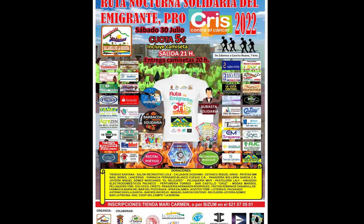 La Asociación Senderista de Zalamea de la Serena ha organizado para el próximo sábado, día 30 de julio, la ruta nocturna solidaria del emigrante Pro Cris, cuya objetivo, además de vivir una noche de convivencia, es recaudar dinero para la lucha contra el cáncer.