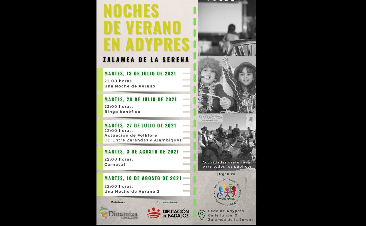La primera de ellas, 'Una noche de verano', tendrá lugar el martes 13 de julio. Una semana más tarde, el día 20 del mismo mes, la sede de ADYPRES acogerá un 'Bingo Benéfico' y el día 27, los asistentes podrán disfrutar de un espectáculo de Folklore denominado 'Coros y Danzas Entre Zarandas y Alambiques', a cargo de la Asociación Cultural 'Asbaraguzza' de Esparragosa de la Serena.
