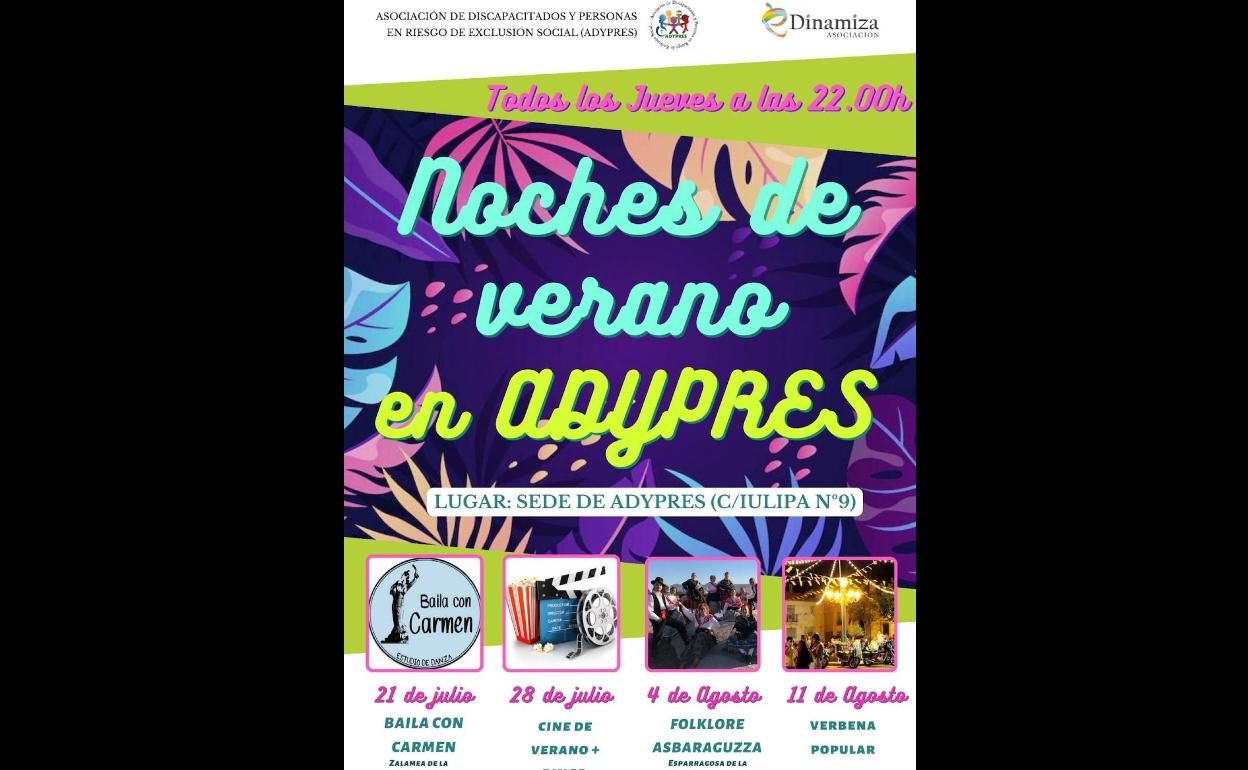Por segundo año consecutivo, la Asociación de Discapacitados y Personas en Riesgo de Exclusión Social, ADYPRES; y la Asociación E-Dinamiza han organizado el programa 'Noches de Verano en ADYPRES'. Concretamente, se trata de un programa de dinamización que se extenderá entre el 21 de julio y el 11 de agosto, e incluye actividades y propuestas de diversa índole.