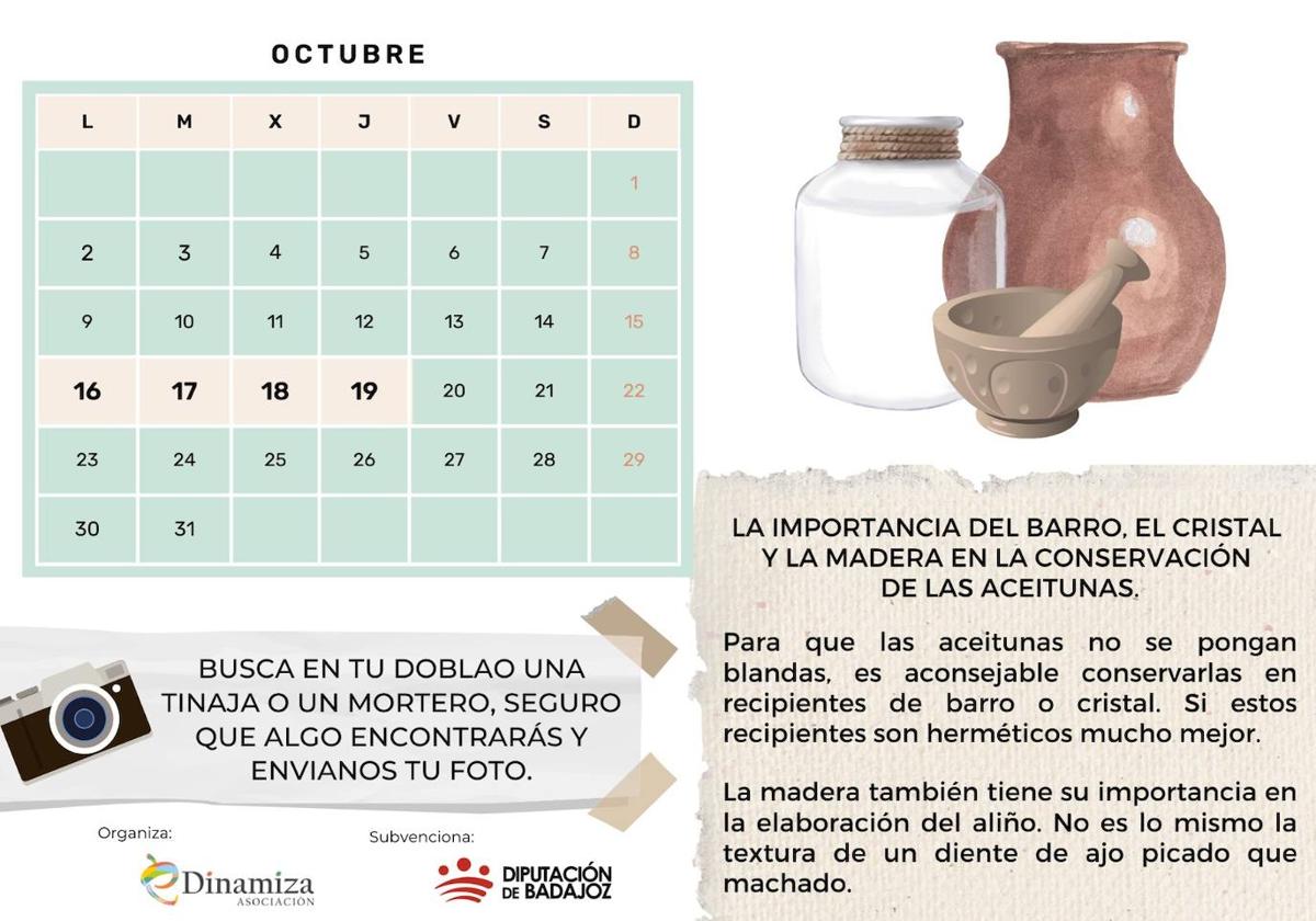 El concurso constará de varias fases de las que se irá informando a través de los perfiles en redes sociales de la asociación. La primera fue sobre el olivar y esta segunda, cuyo plazo para presentar los trabajos finaliza hoy 19 de octubre, sobre los recipientes.