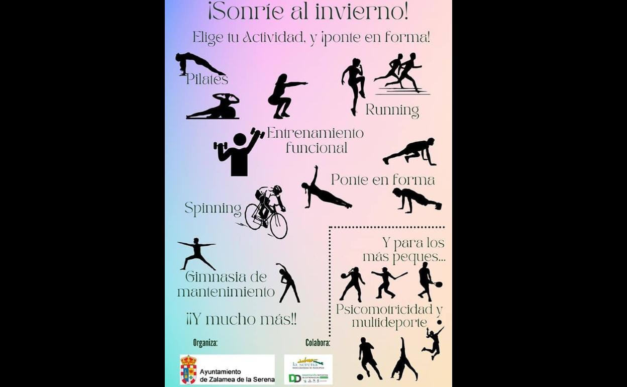 El Servicio Municipal de Deportes de Zalamea de la Serena ha presentado una amplia oferta de actividades, dirigidas a personas de todas las edades, que se desarrollarán a lo largo de los próximos meses. Entre las actividades ofertadas están pilates, running, entrenamiento funcional, ponte en forma, spinning, senderismo y gimnasia de mantenimiento. Además, la oferta de actividades también incluye clases de psicomotricidad, dirigidas a menores 3 a 5 años; y de multideporte, para niños de 6 y 7 años.