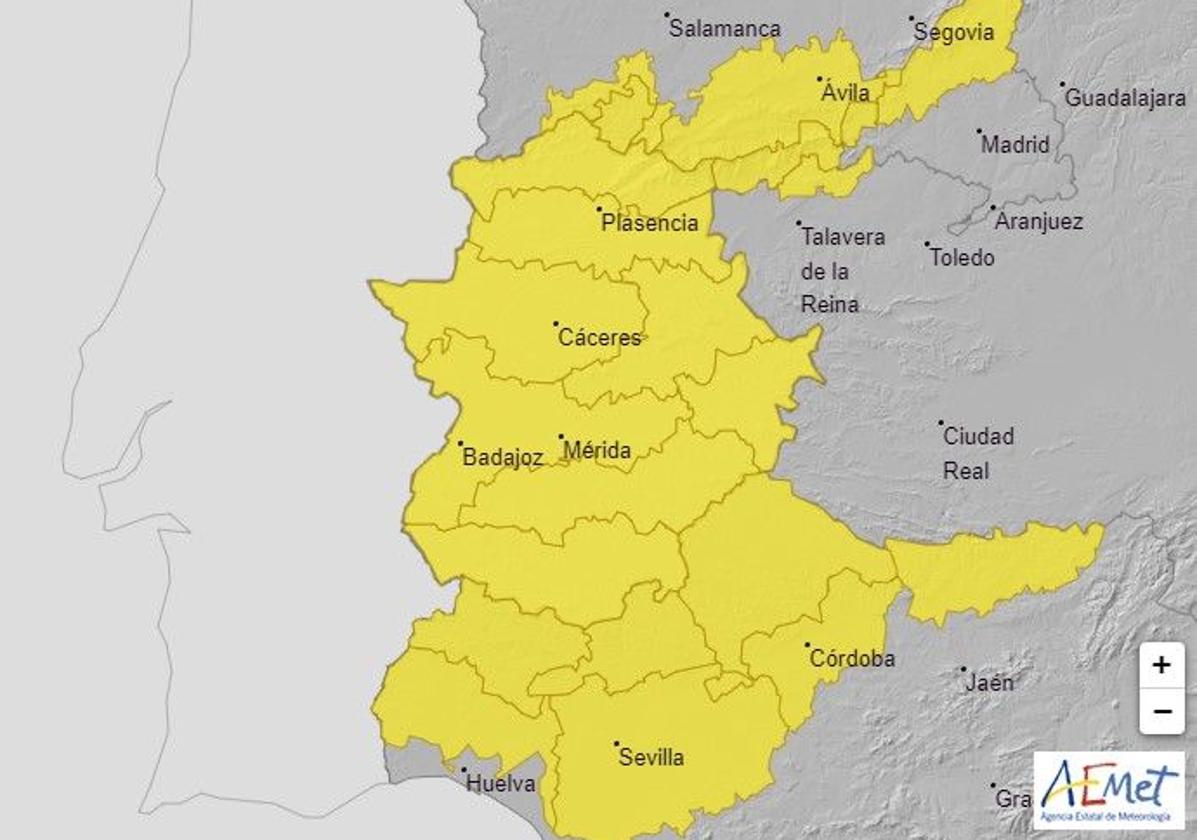En la zona de La Serena, donde se encuentra Zalamea de la Serena, la alerta estará activa desde las 12.00 hasta las 00.00 horas