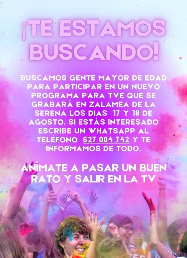 Los interesados en participar en la grabación del programa deben ponerse en contacto a través del número de WhatsApp 627 004 742, donde se les informará de todo.
