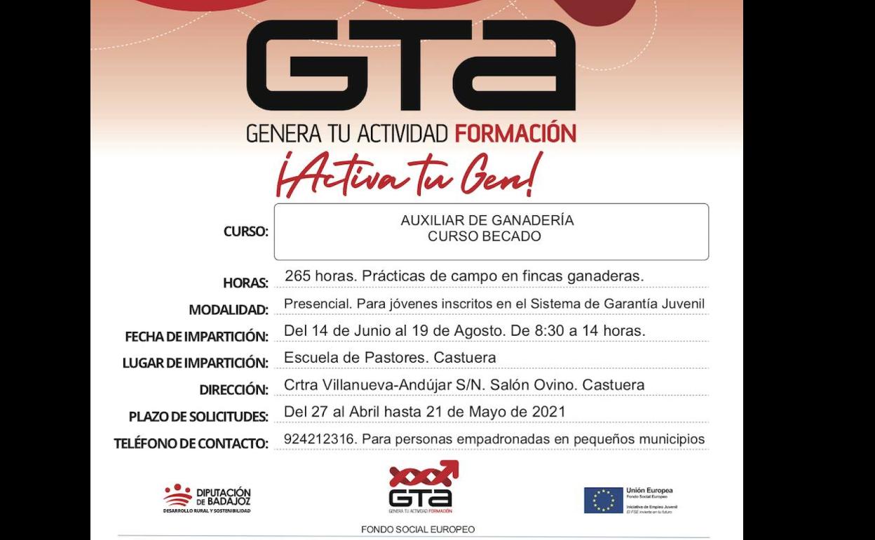 El próximo viernes 21 de mayo es la fecha tope para inscribirse el curso de 'auxiliar de ganadería', ofertado por Diputación de Badajoz. Esta acción formativa está dirigida a personas jóvenes mayores de 16 y menores de 30 años, incluidas las personas con discapacidad o no, en situación de desempleo e inscritos en el Sexpe y no integradas en los sistemas de educación o formación, independientemente de su nivel formativo, que estén inscritas en el Programa de Garantía Juvenil y residentes en municipios de la provincia de Badajoz menores de 5.000 habitantes, o en municipios mayores de 5.000 o menores de 10.000 habitantes con crecimiento vegetativo negativo.