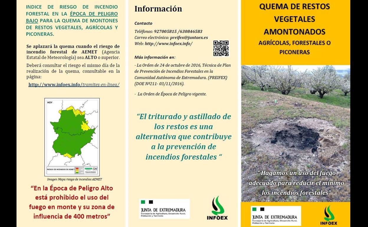El Diario Oficial de Extremadura (DOE) de hoy miércoles 14 de octubre ha publicado la orden por la que, a partir del viernes 16 de octubre, se declara la Época de Peligro Bajo de Incendios Forestales del Plan INFOEX y se abre de nuevo el periodo para la quema de los restos vegetales, entendiendo como tales los restos procedentes de huertas, podas, desbroces, jardinería y otras operaciones inherentes a la agricultura o la gestión forestal.