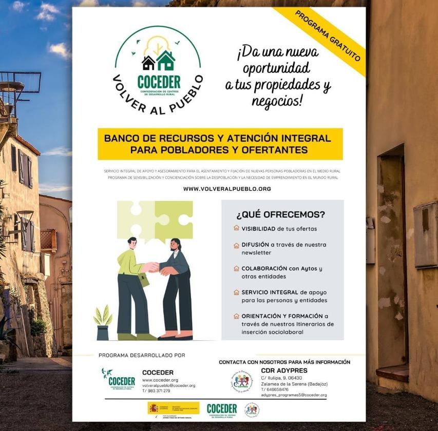 Desde el CDR Adypres Zalamea y Cocer Rural han recordado el proyecto de despoblación que están llevando a cabo; https://volveralpueblo.coceder.org/, a través del cual ayudan a familias a poblar el territorio extremeño facilitándoles recursos para ello; viviendas, ofertas de empleo, traspaso de negocios, terrenos de labor,…