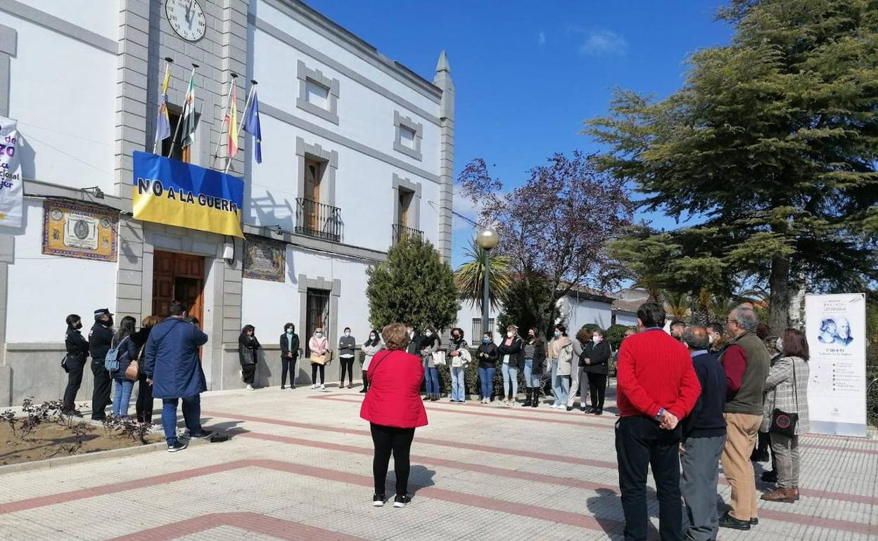 Decenas de vecinos de Zalamea de la Serena se han concentrado a las 12:00 horas de la mañana de hoy en las puertas del consistorio para guardar 5 minutos de silencio en solidaridad con el pueblo de Ucrania.