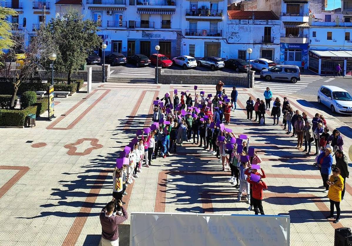 Ayer viernes, día 24 de noviembre, se llevó a cabo la colocación de la pancarta conmemorativa en la fachada del ayuntamiento y la lectura del manifiesto, a las 12.30 horas en la puerta del Ayuntamiento de la localidad, donde además se formó un gran lazo morado con la ayuda de un grupo de escolares del municipio.