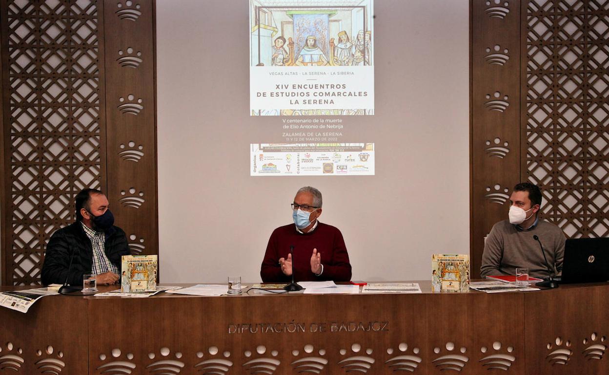 Con motivo del V Centenario de la Muerte de Nebrija, Zalamea de la Serena acogerá los días 11 y 12 de marzo los 'XIV Encuentros de Estudios Comarcales de La Serena'. Un acto que ha sido presentado hoy en la Diputación de Badajoz y que ha contado con la intervención del diputado provincial de Cultura, Francisco Martos; el concejal de Cultura de Zalamea, Félix Huertos; y el presidente de la Asociación Cultural Dystilo, José Damián Gil.